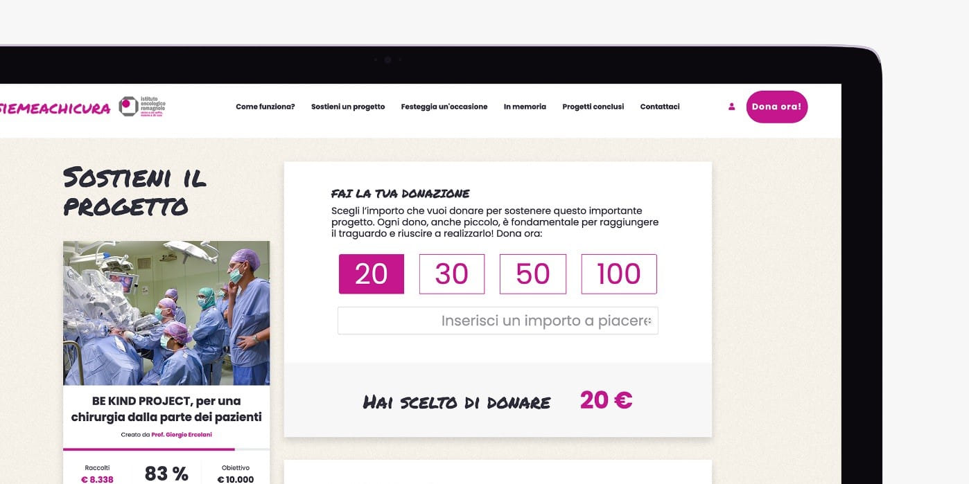 Siamo orgogliosi di sostenere da anni le iniziative di IOR, anche attraverso il nostro lavoro. Questa volta il connubio ha portato alla nascita di una nuovissima piattaforma di digital fundraising con l'opportunità di creare anche iniziative specifiche di peer-to-peer fundrising. Una piattaforma attivata per loro sul portale insiemeachicura.it, e che offre infinite opportunità: